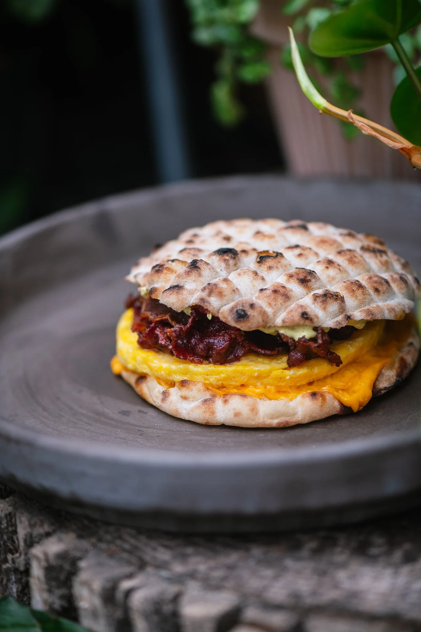 Moussaka-seasoned beef, cheese, runny egg, herbs, Union Loafers sourdough