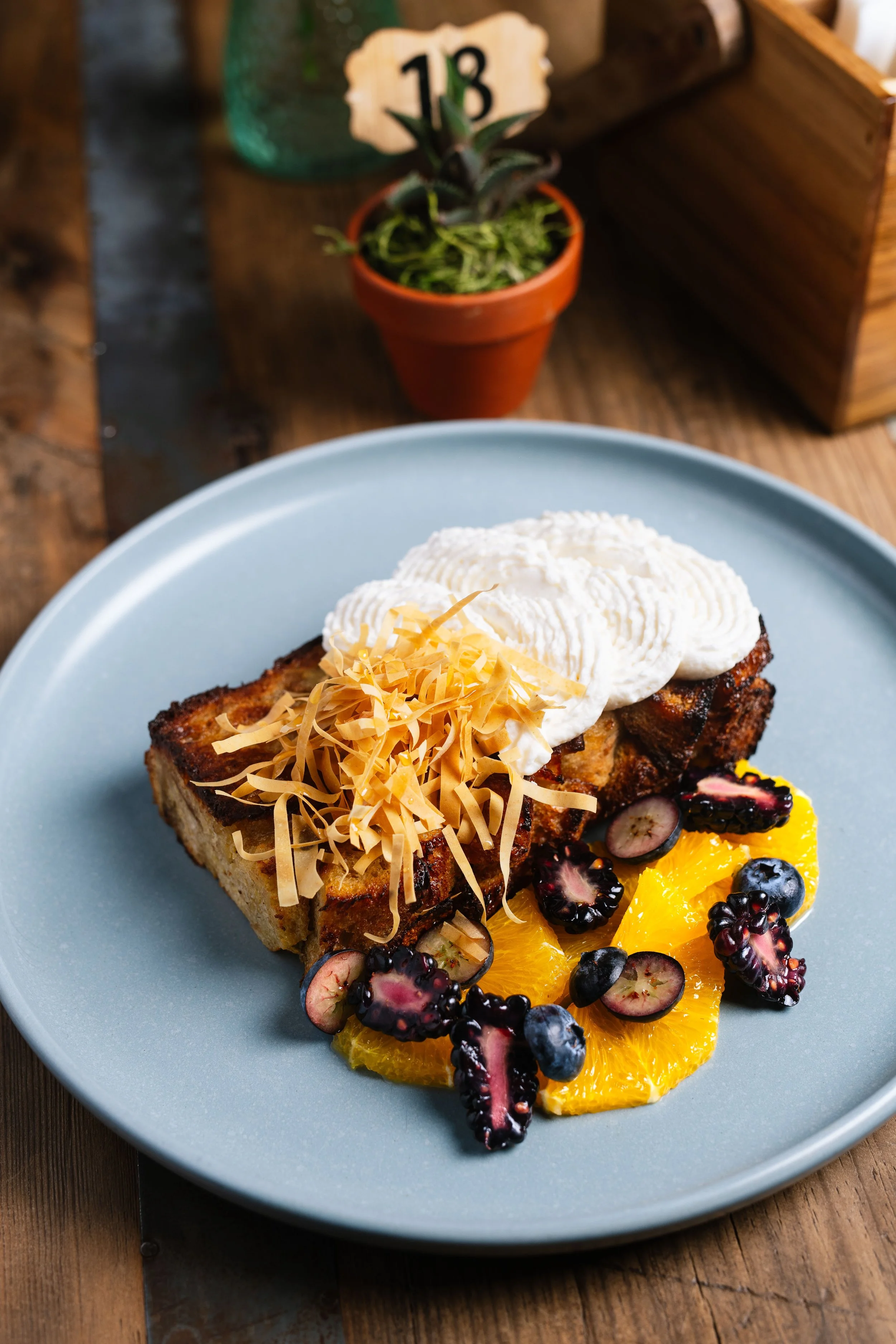 Balkan-style french toast. Custard-soaked toasted bread, fresh fruit. Changes daily.